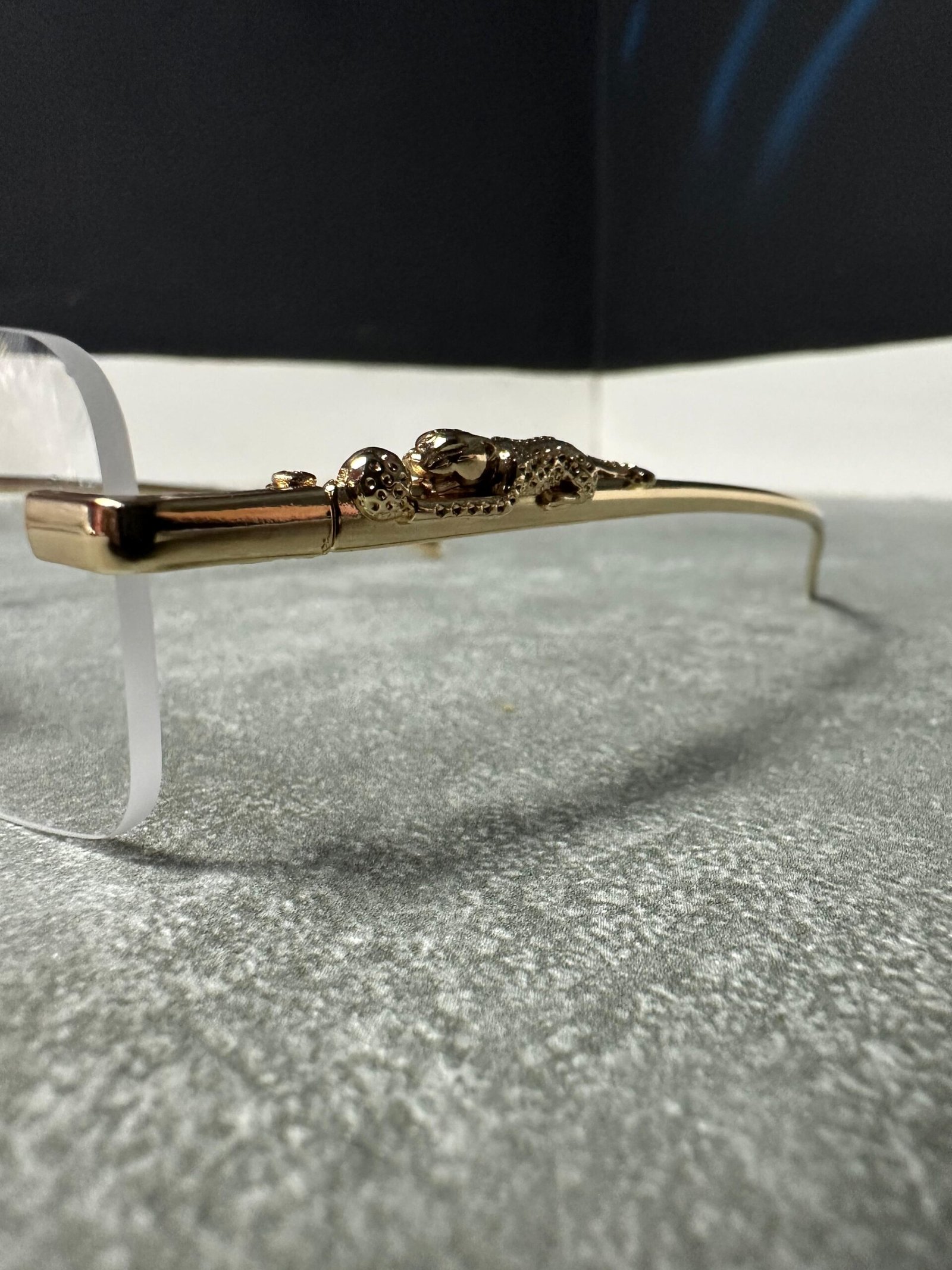 Com hastes metálicas finas em dourado polido e detalhe lateral em formato de onça/jaguar, o modelo traz um visual moderno e refinado, perfeito para compor looks mais sofisticados.